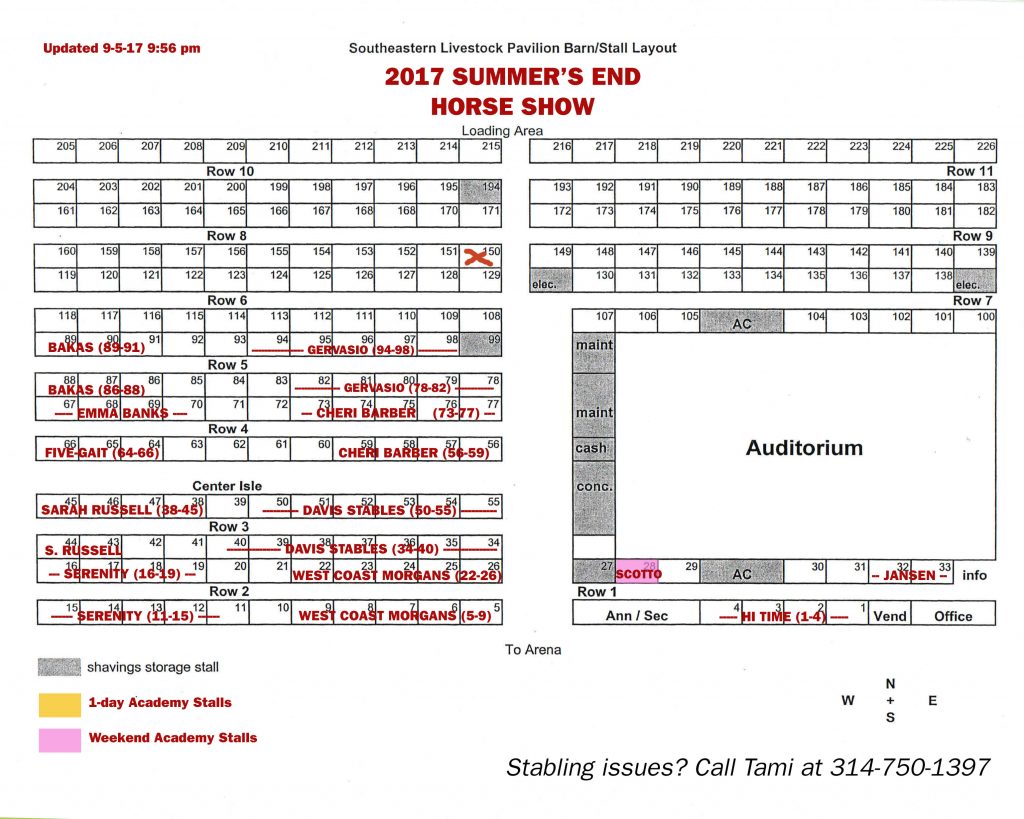 DUE TO THE LIVESTOCK PAVILION TAKING ON EVACUATED HORSES FROM DOWN SOUTH, and of course due to the number of barns that have already cancelled out, we have moved everyone forward on the stall charts. Please note the latest version of the stall chart posted below. We apologize for your stalls not being “the usual”, but we needed to leave the back of the barn open for them to bring in the displaced horses (all of which will have current Coggins, etc.). If you pre-ordered bedding, it will be in front of your stalls tonight, so you should be able to move in anytime tomorrow.